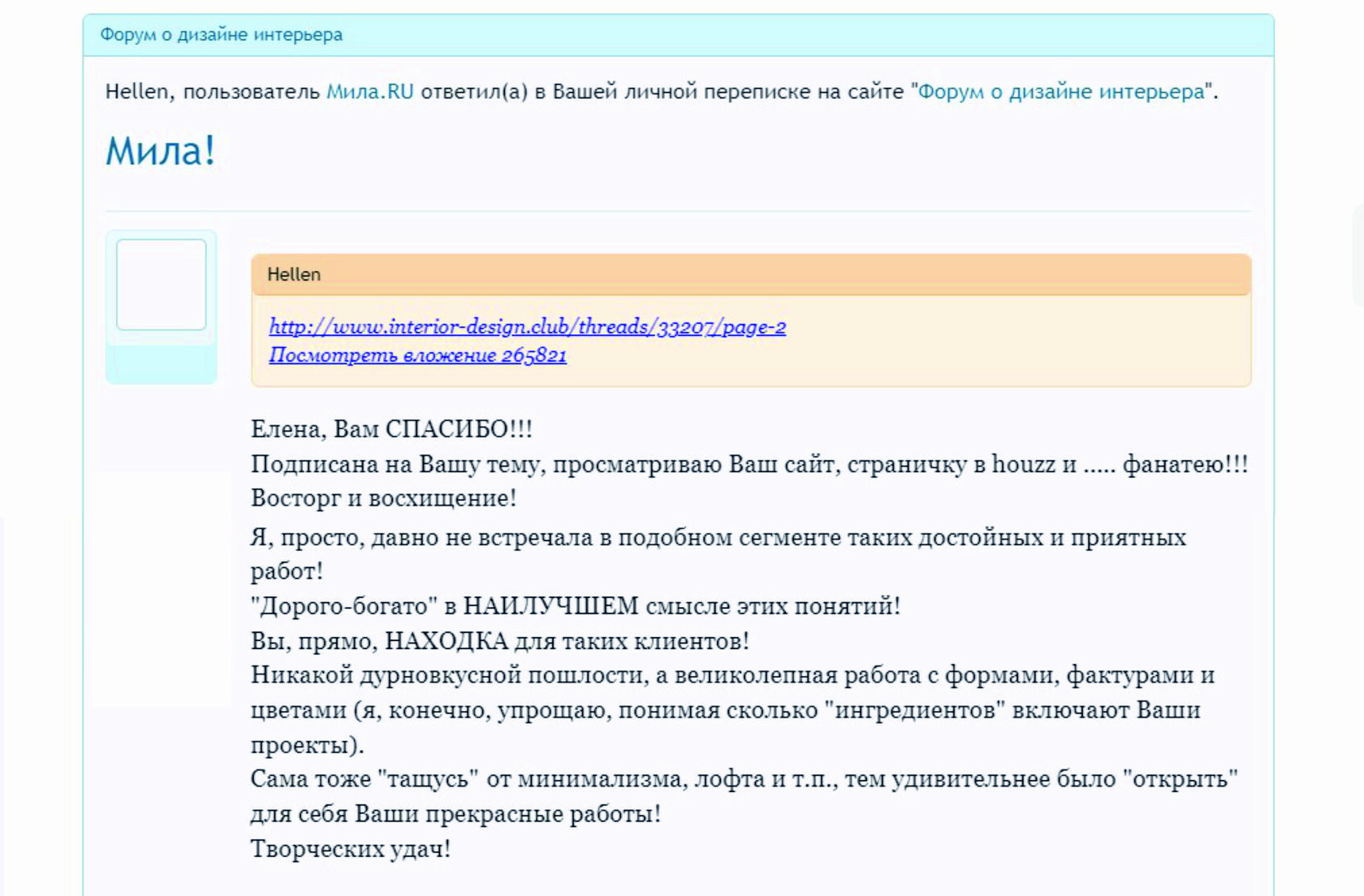 Сейчас я уже живу в этой квартире, вполне всем доволен, все удобно и продумано, сам бы я точно не справился). Спасибо, Елена.